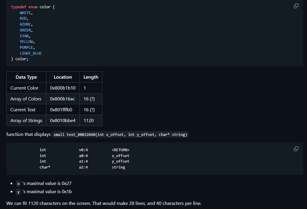 Since we didn't feel very confident about being able to crack a PS1 game open, Clair and I spent a lot of time looking up existing resources about the PS1, the file formats commonly used on the console, how the RAM is ordered, the MIPS assembly it uses, and much more.