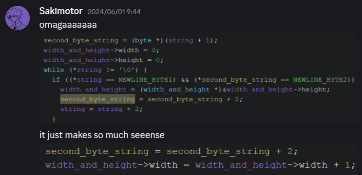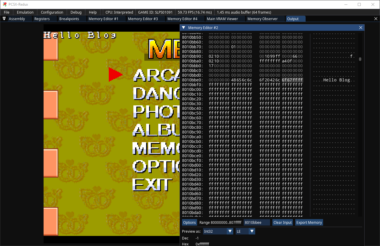 After a whole week of not touching the game and focusing on my studies (and other video games), I was asked by Clair to try inserting some of the edited graphics back into the game. It took some time getting familiar with img2tim, but we eventually made it (yes "we", Clair is the one who figured it out, I kept breaking the CLUT without fault). Since the game was already running, I looked more into the way it'd look for strings. Would they end on a NUL character? Yes, removing it breaks the display. Was the game looking for the byte after the NUL, or some hardcoded space in memory? Unfortunately, it was the latter, which was a sign of the game using pointers.