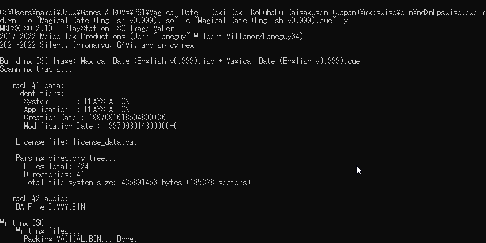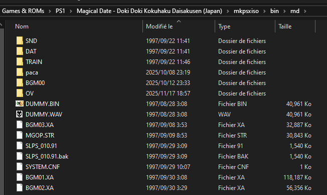 First, we needed a way to extract and rebuild the game's disc structure. Thankfully, this is nowadays an easy task, thanks to Lameguy64's mkpsxiso/dumpsxiso toolset. You dump the contents of a bin/iso with dumpsxiso, which gives you a nice folder arborescence and an .xml file that contains the structure of the disc. Said XML can then be used to rebuild the folder back to the bin/iso format with mkpsxiso.