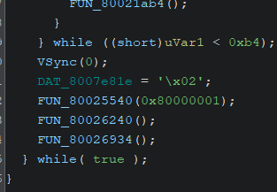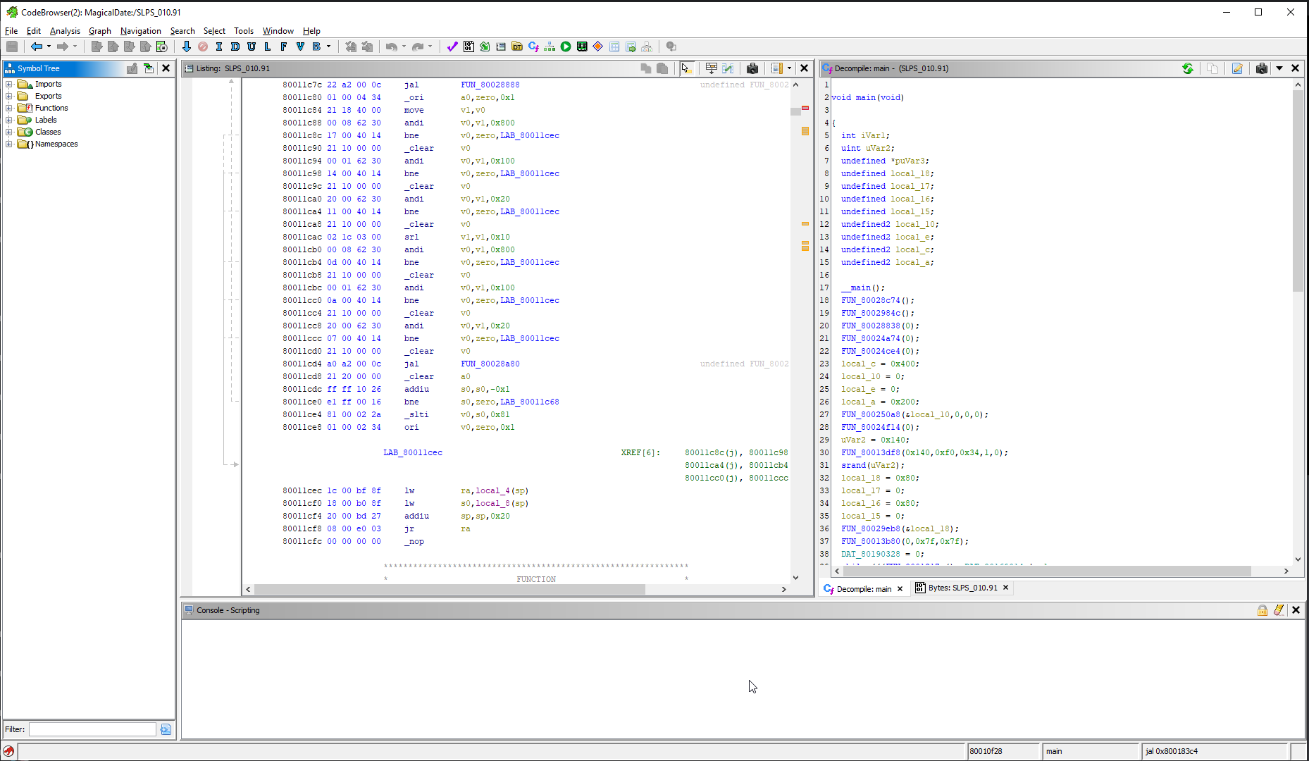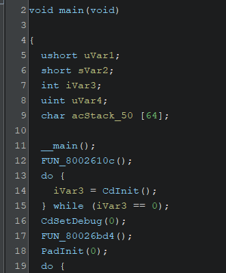 Well, let's see if MAGICAL.BIN is as easy to deal with then, what do we have in the main function ? Something about initializing the Cd and the Pad... a sprintf call (???), and an infinite loop... Yeah, this is as far as we could go with static analysis. Let's find an emulator that has breakpoints (preferrably all kinds of them but an execution breakpoint would be a good start), and try seeing which functions do what by setting breakpoints at all the FUN_address locations.