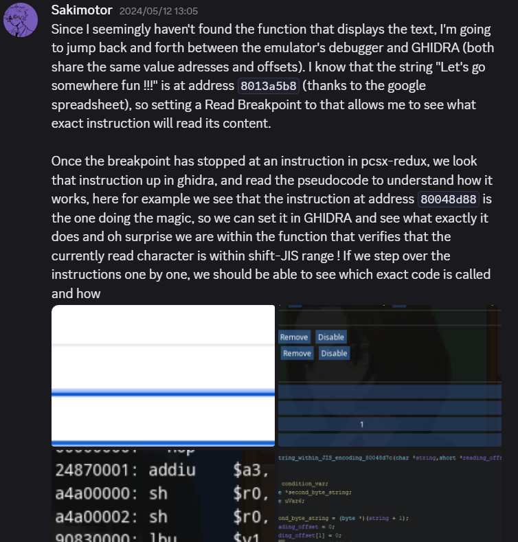 One fair assumption I've had about the game was that, just like it's the case for 99% of the console's titles, the font would be a custom one, stored somewhere as a .TIM file or something similar. I had spent days looking for it, to no avail. At some point, I had imported all of the game's overlays into Ghidra, scanned them for Encoded strings, and exported said strings into a Google Spreadsheet for Clair to translate. This meant more work (and steady progress) for Clair, and more reasons to get things done on my end (the translation can only be shown if I find a way to display half-width characters!). This also meant that I knew where all strings would be located in memory, and was able to set read breakpoints on them to tell which functions actually display the text.
