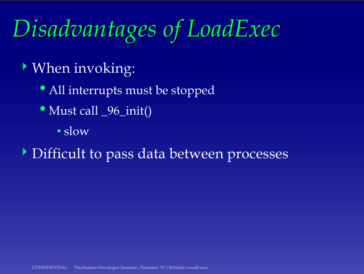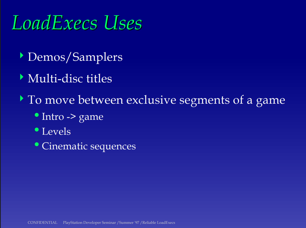 Alright, this will require some explanation, but since the PS1 (Psy-Q) SDK's documentation has been made available online, searching up that function name gives us a very detailed slideshow which explains to developers its' purpose and usage. From this document, we learn that LoadExec, as its' name indicates, loads an executable into memory. It is often used to segment stages into separated executables, for demos, or, you guessed it, "cinematic sequences". It also says some stuff about overlays, but we'll get to that later. Finally, it mentions that _96_init() must be called, which our executable does, so there is no doubt about the usage of that function: what I referred to as the "main" executable is nothing but a program made to load the main opening, likely because storing the FMV and the rest of the executable data was not possible in a way that would make the whole game fit into 2MB.