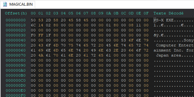 This executable file was... Weird, to say the least. For some reason, even though its' size was 1.50MB, half of this space was zeroed out, almost as if it was only there for padding purposes. It definitely was an executable since, as zanneth's post about PS-X EXE files says, the file started with the "PS-X EXE" magic bytes, followed by some information related to the executable, then "Sony Computer Entertainment Inc. for Japan area", and finally, zeroed-out bytes of padding until we'd reach 0x800.
