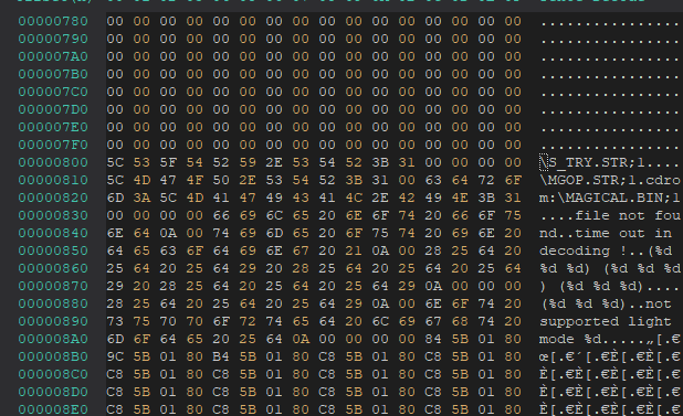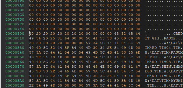 There were also couple .BIN files at the root of our game which didn't seem to contain any image. The first one was a DUMMY.BIN file, which was just 45MB of padding, a seemingly common anti-piracy measure back then.