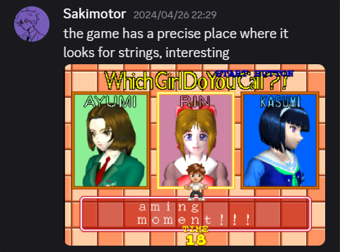 Anyway, about the technical part earlier... Since we now had a way of editing .BIN files containing sprites, this effectively meant that Clair could go full gear with the graphical work. I, on the other hand, had a tremendous task assigned: it was up to me to reverse engineer and understand enough of Magical Date to make it possible to insert English into a game which at first glance only seemed to accept Japanese text encoded with Shift-JIS. That's right, it was Ghidra time, but not only. Strap in, this will be a long one!