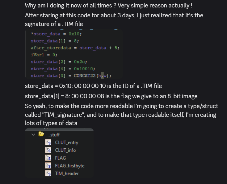 At some point, Clair needed to have the height of a particular TIM file expanded, doubling it in size. This would usually be no big deal, but it posed a problem to us: most of the game's TIMs were contained inside of, very basic but still existent, .BIN archives. Said archives' format is pretty easy to explain, I had made an explanatory screenshot of it back then, and a BIN Repacker Python3 script which would reinsert a .TIM right where it belongs. Making and debugging this script took about half a week, and this was probably the moment when it was kind of naturally imposed upon me to handle the translation's technical aspects from then on, and for Clair to do the translation and sprite editing work I would never ever be qualified for even if I tried.