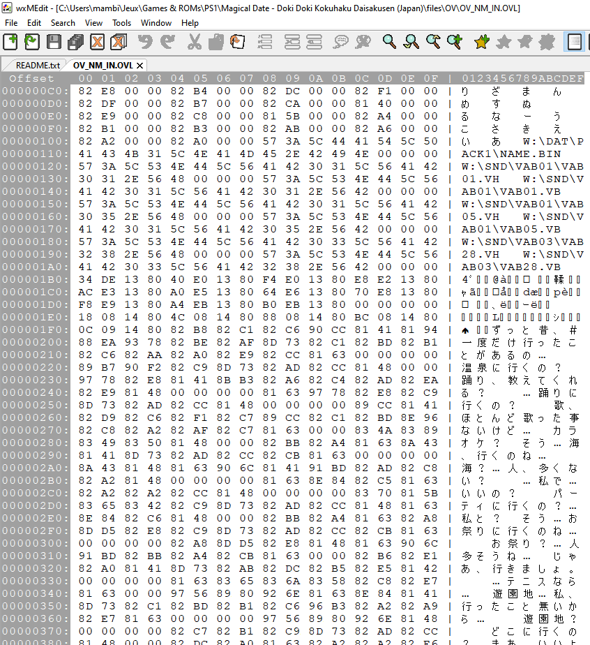 I started looking for a Hex Editor which would display the japanese strings directly, as my goal back then was just to find the text and see if it could be edited to English. HxD Editor might be nice, but it only supports ASCII. wxMEdit on the other hand was just what we needed. It took me 5 whole days to successfully display "English" letters ingame, partly because I was too dumb to realize I was editing the text too late in-between my attempts on the fly, but also because ASCII was not accepted by the game's code, so I had to use full-width characters, which would obviously not be suitable on the long term. Yes, at this point I was yet to rebuild any iso, I was still loading save states and editing the memory on the fly, byte by byte, which was a tremendous waste of time.