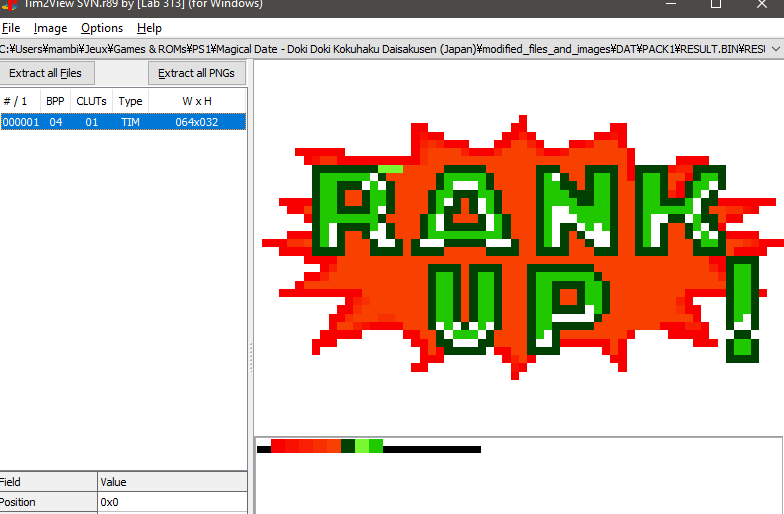 Until early October of this year, the "RANK UP!" message was broken... Because I hadn't preserved the rightful CLUT. I needed to learn how to use some new program known as TIM Tool (yes, like the dozen other TIM Tools).
