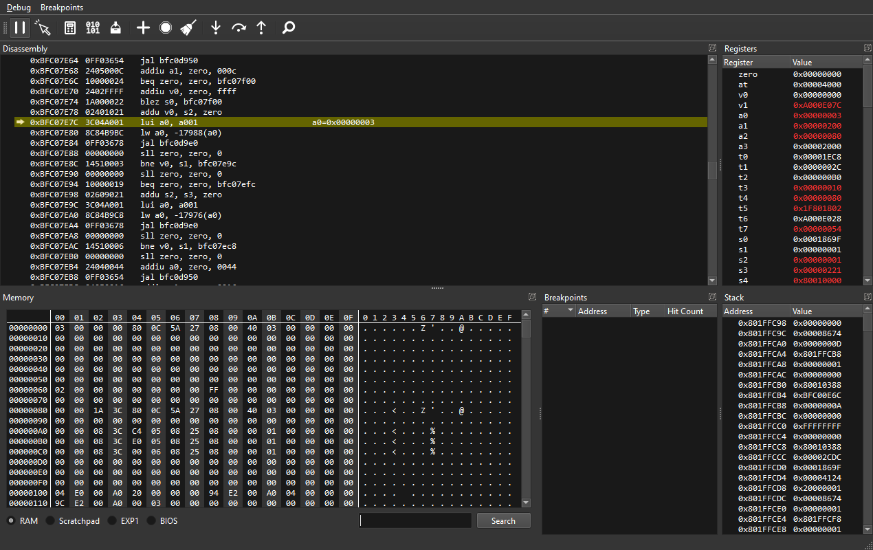 I wasn't really looking forward to this part, honestly speaking. Whenever I work on any program, my "debugging" could be summed up as a minefield of printfs and condition checks, so working with an actual debugger sounded scary at first. I found a 2010 guide on the matter that sounded good enough, gathered my courage, and started looking for a PSX Emulator that would feature advanced enough debugging tools. It would probably not be ePSXe, and even though no$psx and pcsx were seemingly used a lot for debugging purposes, I wanted an emulator which would either be extremely robust in its' debugging features, or one that would have decent debugging features and be widely used by your average emulation enthusiast. More explicitly, I was split between Duckstation (which I probably don't need to introduce) and PCSX-Redux, a fairly niche emulator made with reverse engineers and PSX devs in mind. I tried going with the former, but Duckstation's debugging features are really... not there.