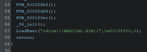 Well, let's see if MAGICAL.BIN is as easy to deal with then, what do we have in the main function ? Something about initializing the Cd and the Pad... a sprintf call (???), and an infinite loop... Yeah, this is as far as we could go with static analysis. Let's find an emulator that has breakpoints (preferrably all kinds of them but an execution breakpoint would be a good start), and try seeing which functions do what by setting breakpoints at all the FUN_address locations.