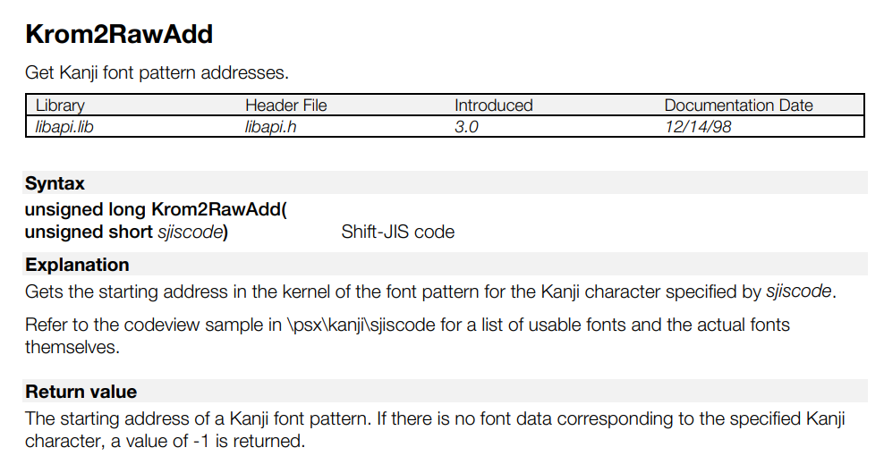 Here is another fun fact about this translation. There is actually a very obvious reason why the game's font is nowhere to be found in the VRAM: it doesn't need to be there! The font the game is using is the default SJIS font every console is bundled with, and, appearance aside, there is one function that gives it away: Krom2RawAdd. Once I was made aware of that, and the "LoadFnt" function of the PS1, I tried with all my might to bend them to my will and make them display half-width characters, or to change the game's font display routine to make the 16x16 characters into 8x8, kind of like Symphony Of The Night does it.