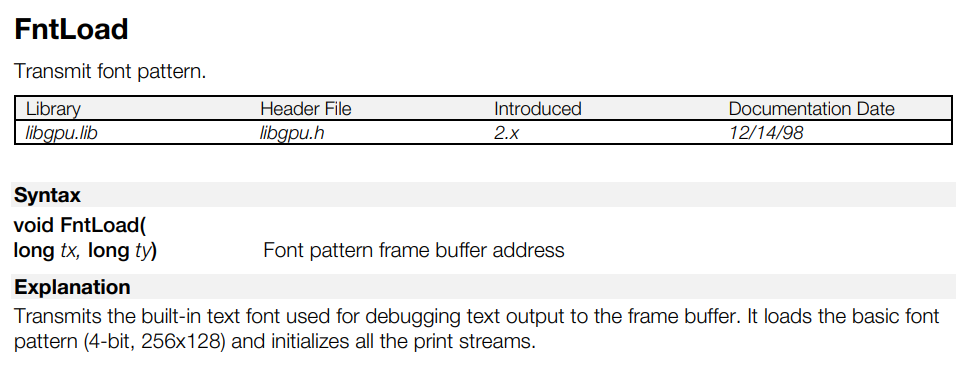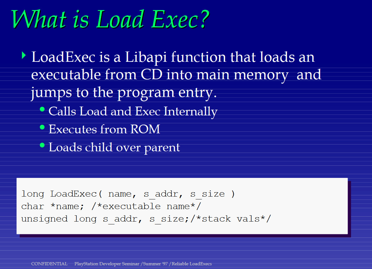 Alright, this will require some explanation, but since the PS1 (Psy-Q) SDK's documentation has been made available online, searching up that function name gives us a very detailed slideshow which explains to developers its' purpose and usage. From this document, we learn that LoadExec, as its' name indicates, loads an executable into memory. It is often used to segment stages into separated executables, for demos, or, you guessed it, "cinematic sequences". It also says some stuff about overlays, but we'll get to that later. Finally, it mentions that _96_init() must be called, which our executable does, so there is no doubt about the usage of that function: what I referred to as the "main" executable is nothing but a program made to load the main opening, likely because storing the FMV and the rest of the executable data was not possible in a way that would make the whole game fit into 2MB.
