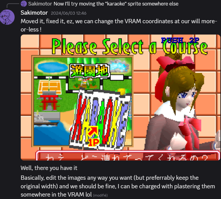During those months of nothingness, I begged for help on RHDN, got some advice from PSXCraver, and wasted enough time to even involve Dimcas with my shenanigans, also begging him for help. I had tried changing the game's code so the Krom2RawAdd calls would take an ASCII character and convert it to SJIS (there is actually an example in the Psy-Q SDK that does just that), or to squeeze its' characters to 8x8 for months, to no avail. I was hopeless about the project's completion, even though Clair was able to edit all of the game's graphics completely alone by Christmas 2024 and release a first demo of the game with all of the location names and minigame tutorials/conditions translated to English.