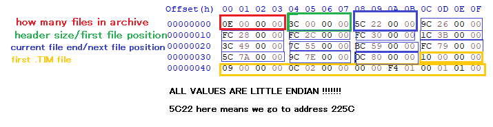 At some point, Clair needed to have the height of a particular TIM file expanded, doubling it in size. This would usually be no big deal, but it posed a problem to us: most of the game's TIMs were contained inside of, very basic but still existent, .BIN archives. Said archives' format is pretty easy to explain, I had made an explanatory screenshot of it back then, and a BIN Repacker Python3 script which would reinsert a .TIM right where it belongs. Making and debugging this script took about half a week, and this was probably the moment when it was kind of naturally imposed upon me to handle the translation's technical aspects from then on, and for Clair to do the translation and sprite editing work I would never ever be qualified for even if I tried.