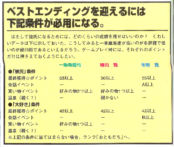 Eventually, I gave the game a try myself, and that's when it dawned upon me: as Taito loved doing it back then, Magical Date features arank system, which is depicted with Stars on the recap screen after clearing each minigame. If you suck at those quizzes, the girl will more likely than not end up heartbroken, and your final game rank will suffer in consequence. Later, thanks to the Strategy Guide, Clair confirmed to me that each girl can give you either the "BOY FRIEND", the "SWEETHEART", or the "KISS" ending, and that those endings depended not only on the player's ability to clear the minigames, but also some specific conditions such as the rank you obtain when the girl quizzes you or how many of the outfits you picked ended up to the girl's liking. There was a clear incentive to make the game "playable" for the EOPs of my kind now!