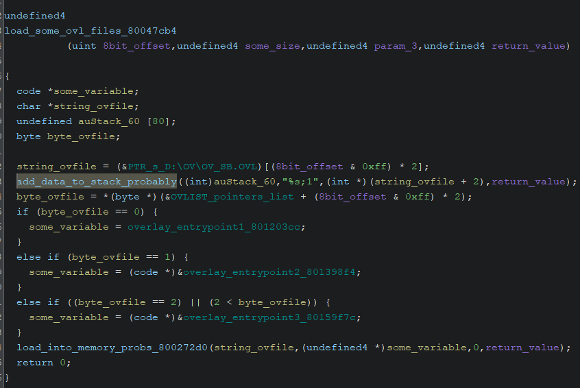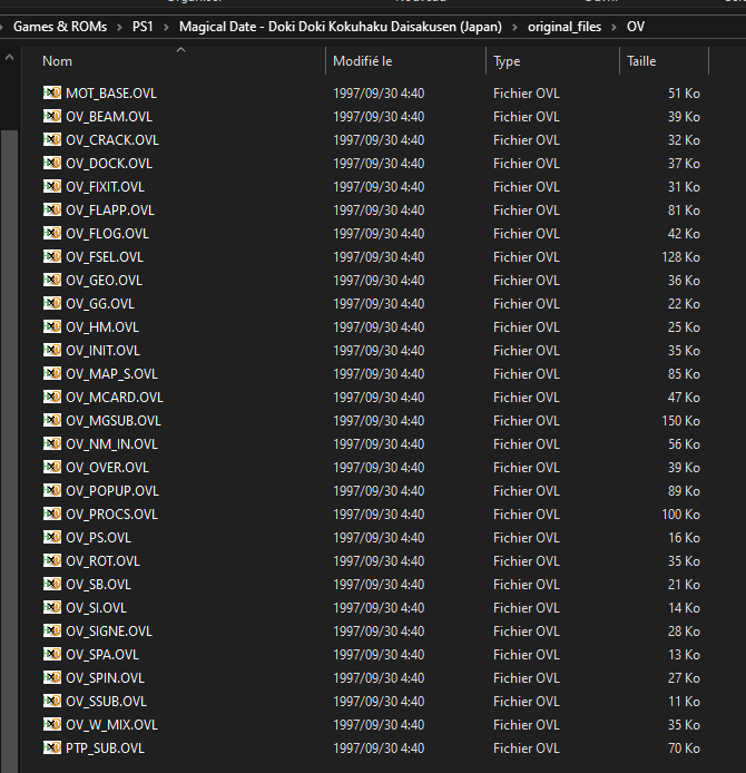 Okay, truth be told, we didn't get to the technicalities on our own right away. Our first main lead was Tetracorp's series of posts about the analysis of TokiMemo: Forever With You since it's also a PS1 game. The first post alone introduced us to a Ghidra PSX Plugin, the general process of "renaming stuff until the code makes sense", the PS1's Memory Map and how it begins at 0x80000000 rather than 0x0, and even the concept of Overlays, which wasn't super clear from that one post alone, but gave me a lead about what to look for next. We'll get back to the rest later, but that piece of information was eye-opening since the game features an "OV" folder, inside of which were .OVL files that didn't seem to be archives of any kind.