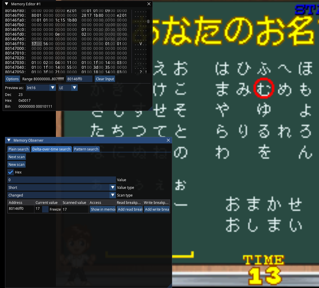 Anyone who used Cheat Engine before knows how memory observers work: you scan the program's current memory, then you do something specific, then you look for changed values, rinse and repeat until you filtered out all the "irrelevant" data. When you only have a dozen candidates left or less, you start editing those memory locations, and hoping they'll do what you'd expect them to. I was having lots of fun taking notes about the process and showing Clair that I was indeed doing more than fruitlessly opening Ghidra and blankly staring at functions I understood nothing about lol