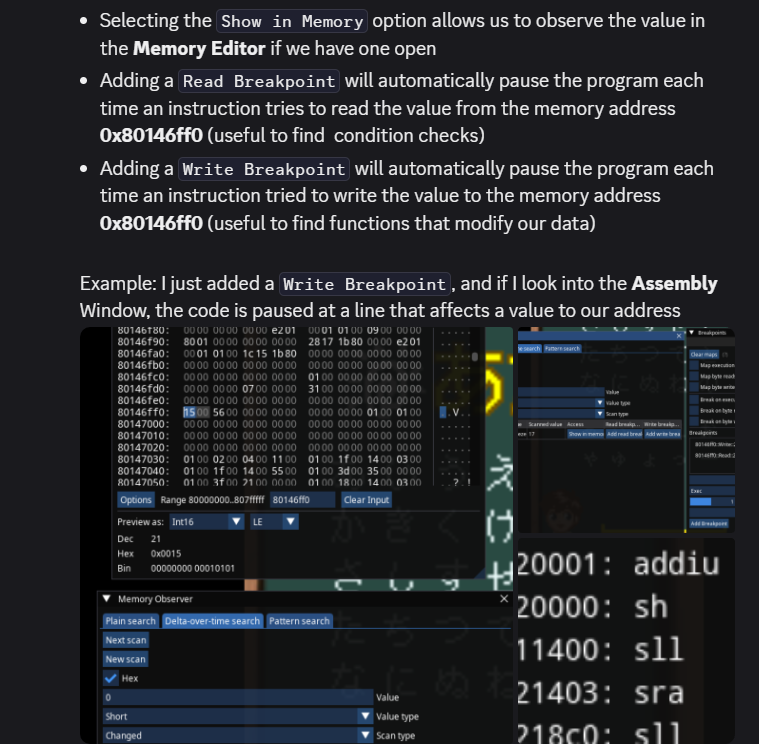 So that's how the debugging went: looking for interesting values in memory with the observer, finding which functions act on them, analyzing those functions in Ghidra at the same time in hopes of understanding how everything works better. At that point there wasn't helping it, we had to learn how PSX-related MIPS Assembly is standardized, most importantly which registers would be used for what but also which operations were available.