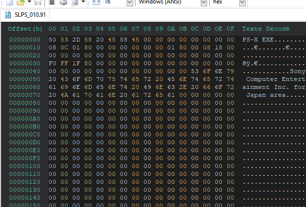 This executable file was... Weird, to say the least. For some reason, even though its' size was 1.50MB, half of this space was zeroed out, almost as if it was only there for padding purposes. It definitely was an executable since, as zanneth's post about PS-X EXE files says, the file started with the "PS-X EXE" magic bytes, followed by some information related to the executable, then "Sony Computer Entertainment Inc. for Japan area", and finally, zeroed-out bytes of padding until we'd reach 0x800.